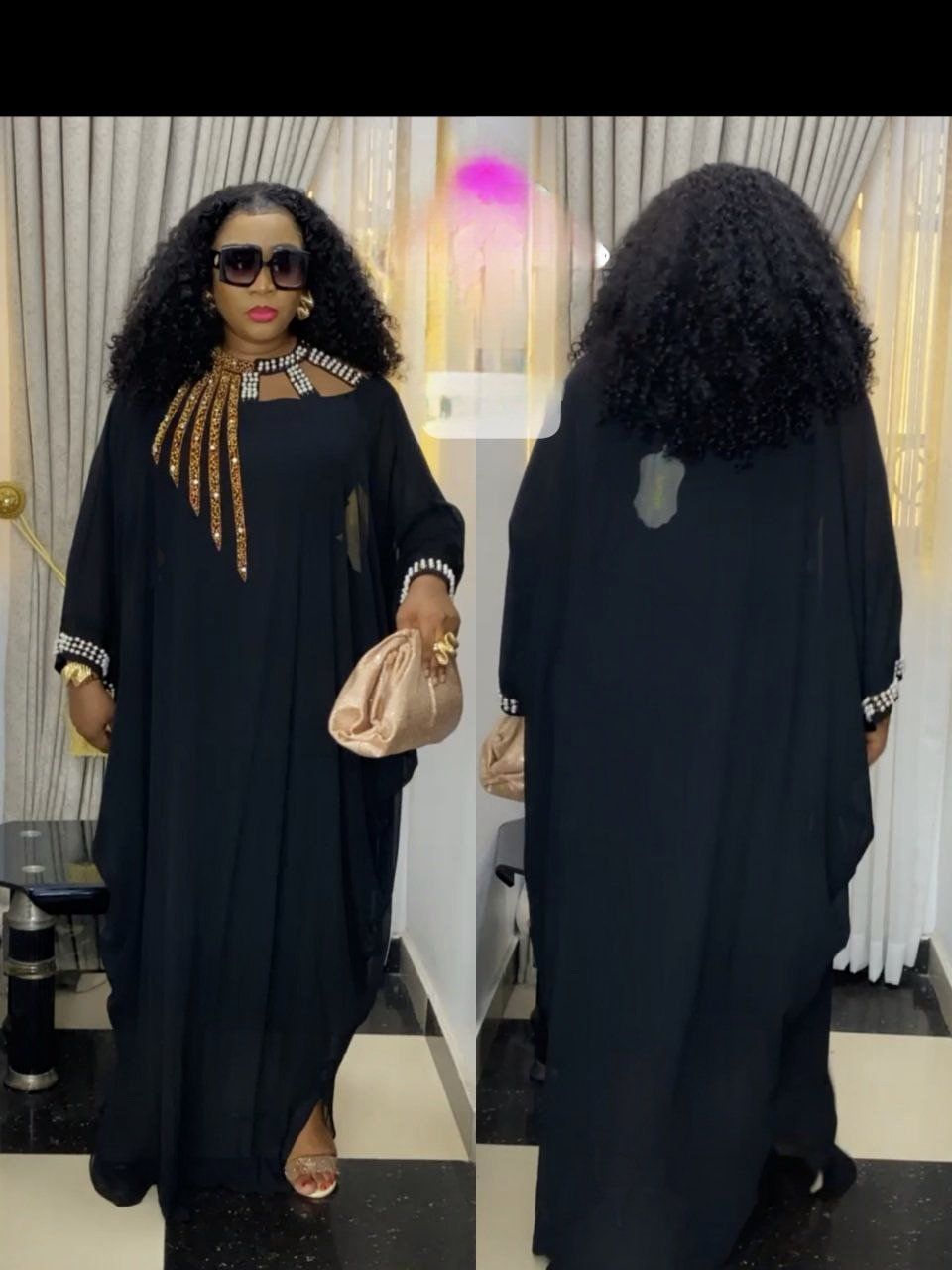 La matière est chiffon. Lâ robe détaillé au niveau de cou avec un strass .La manche est bien coude avec un perle.La taille disponible est 44,46&48